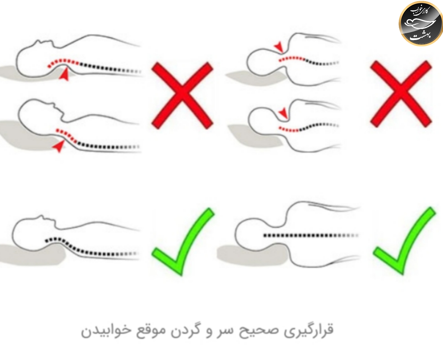 در خوابیدن به پشت هم ارتفاع بالش باید طوری باشد تا سرو گردن در راستای ستون فقرات قرار بگیرند نه خیلی بالاتر و نه خیل پایین تر.
